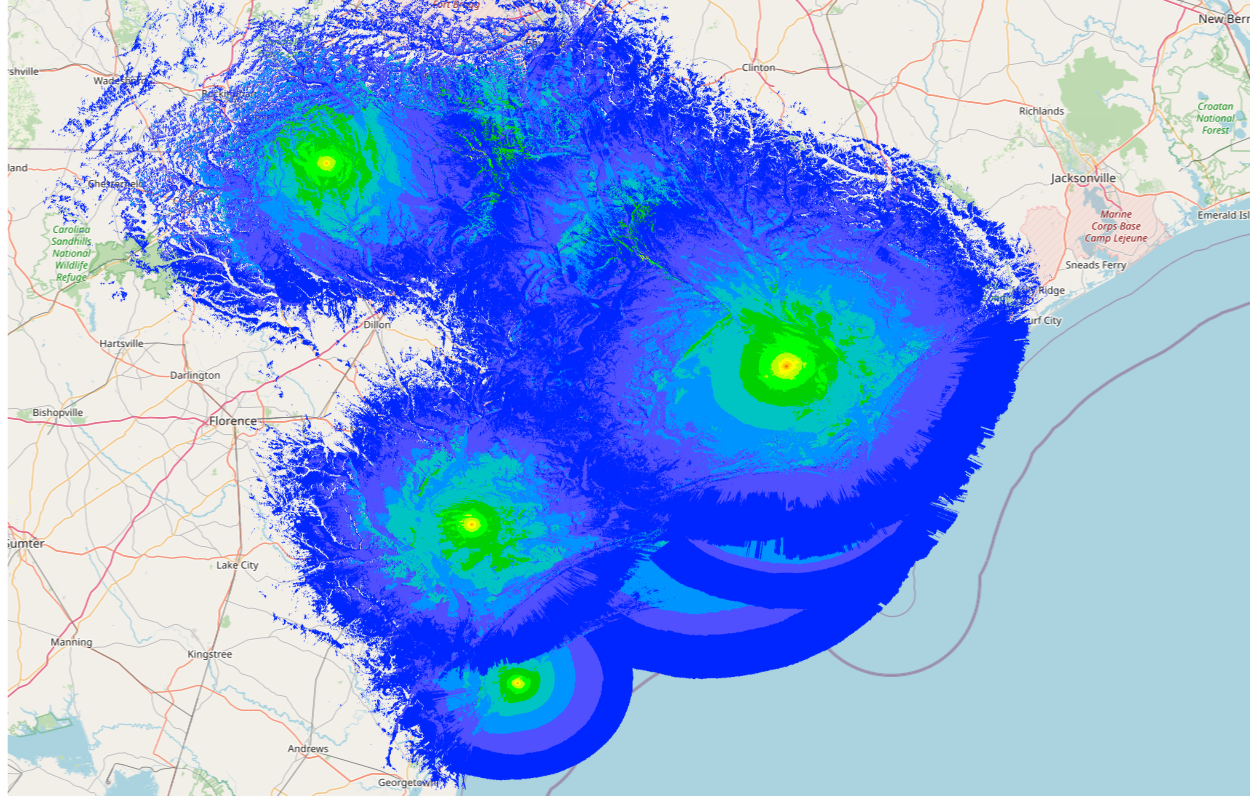 314392 – Fayetteville, NC – TX 439.0875, RX 449.0875 (note the non-standard +10 MHz shift!) Motorola DR3000 (AKA XPR8300) repeater at 40 watts. Duplexer is a Wacom WP-678-R2 and the antenna is a DB413 8-bay offset at 975 feet AGL. Antenna pattern favors NNE toward Fayetteville.